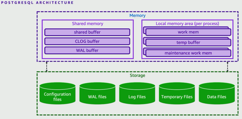 PostgreSQL divides memory into two distinct areas: shared memory (used by all processes) and local memory (per-connection).