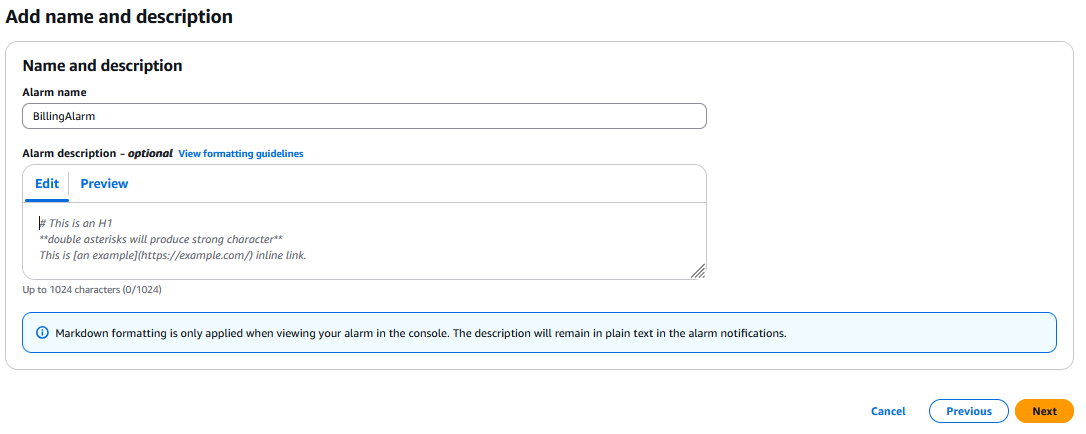Isso ativa os alertas de cobrança pela AWS CloudWatch.