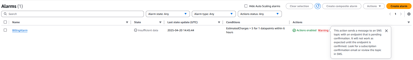 Confirmando o E-mail: Após a criação do alarme, acesse o e-mail que você cadastrou e confirme a inscrição (subscription) para começar a receber os alertas.