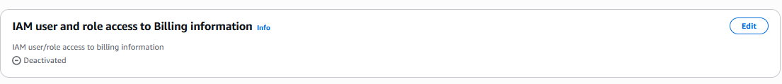 Para resolver esse problema, acesse a conta Root, vá até Billing and Cost Management > Account e localize a seção “IAM user and role access to billing information”. Ative a opção “IAM user/role access to billing information”. Isso concederá ao nosso usuário admin permissão para acessar o Cost Explorer, além de visualizar as informações de cobrança (billing information).