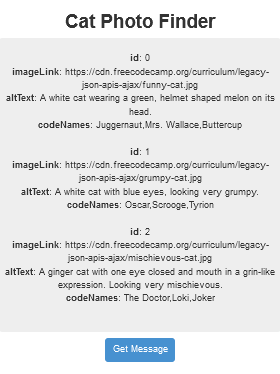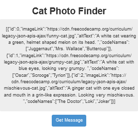 The last few challenges showed that each object in the JSON array contains an imageLink key with a value that is the URL of a cat’s image.